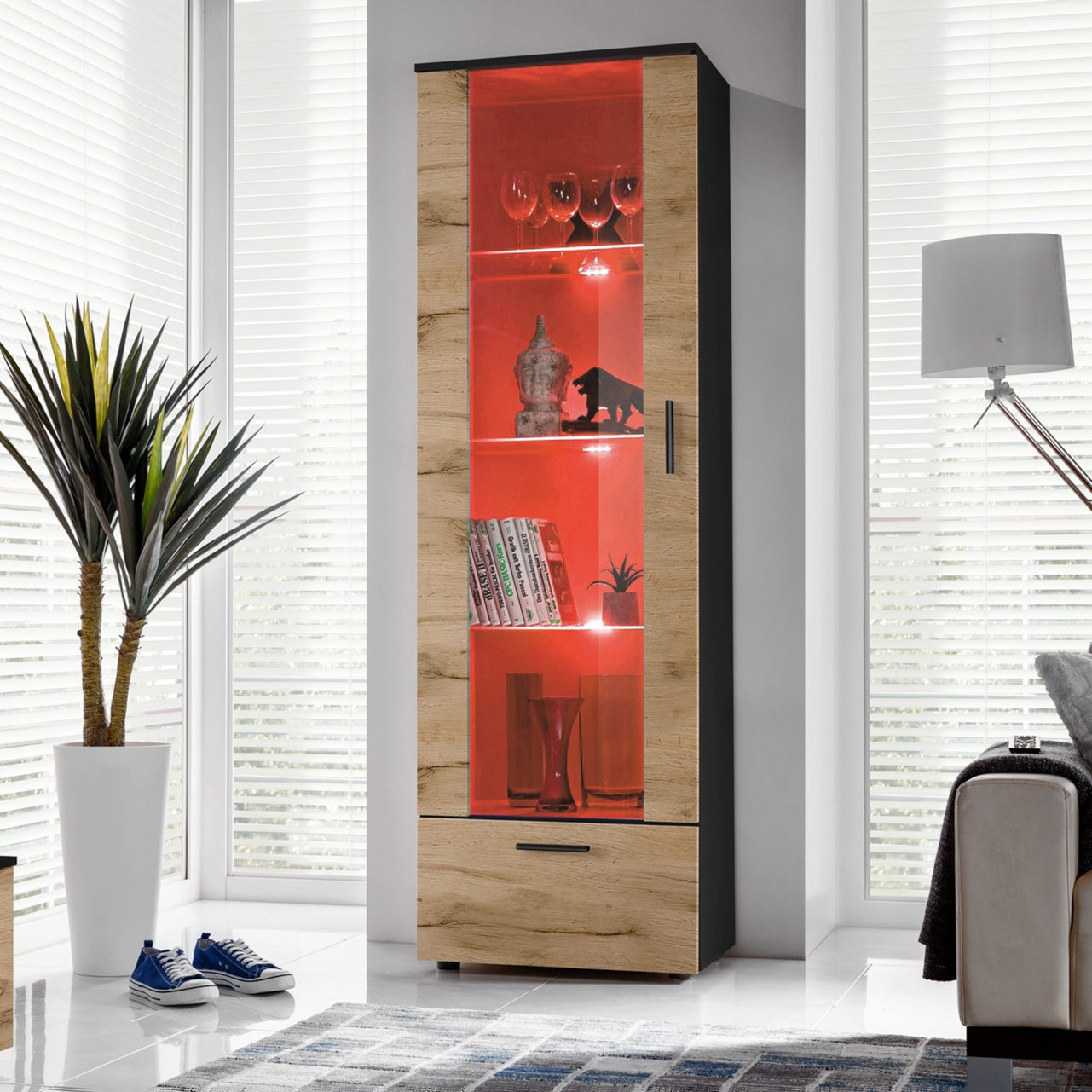 Geometric shapes and clean lines give the Alessandria display cabinet a sleek, modern, and elegant appearance. The piece fits into a wide range of interior styles, especially modern and Scandinavian ones. The cabinet is available in a broad range of colors. While designing Alessandria, we also focused on organizing the interior layout. Inside, you’ll find space for your favorite books, documents, keepsakes, or teacups. Combined with discreet LED lighting (optional) and glass shelves, it creates a refined charm.