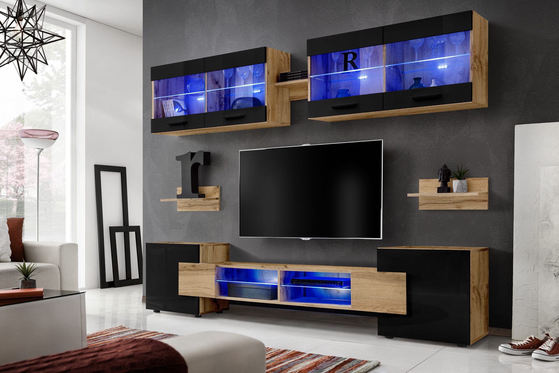 The Foggia furniture collection combines multiple functions. The central piece is an original and refined TV cabinet, ideal for placing television and audio equipment. The set also includes two glass-fronted wall cabinets and three small shelves. There is space for books, keepsakes, documents, porcelain, and art.