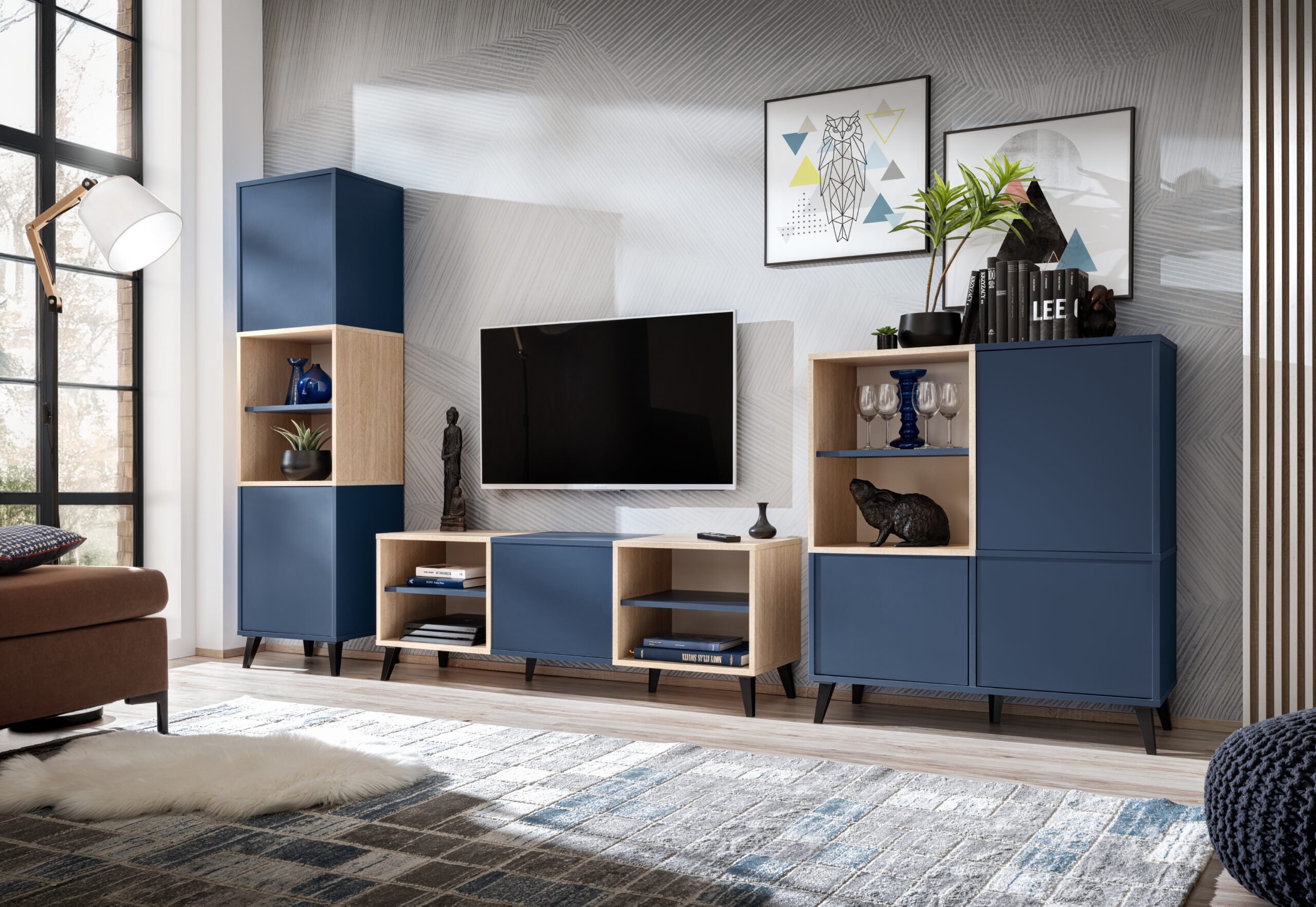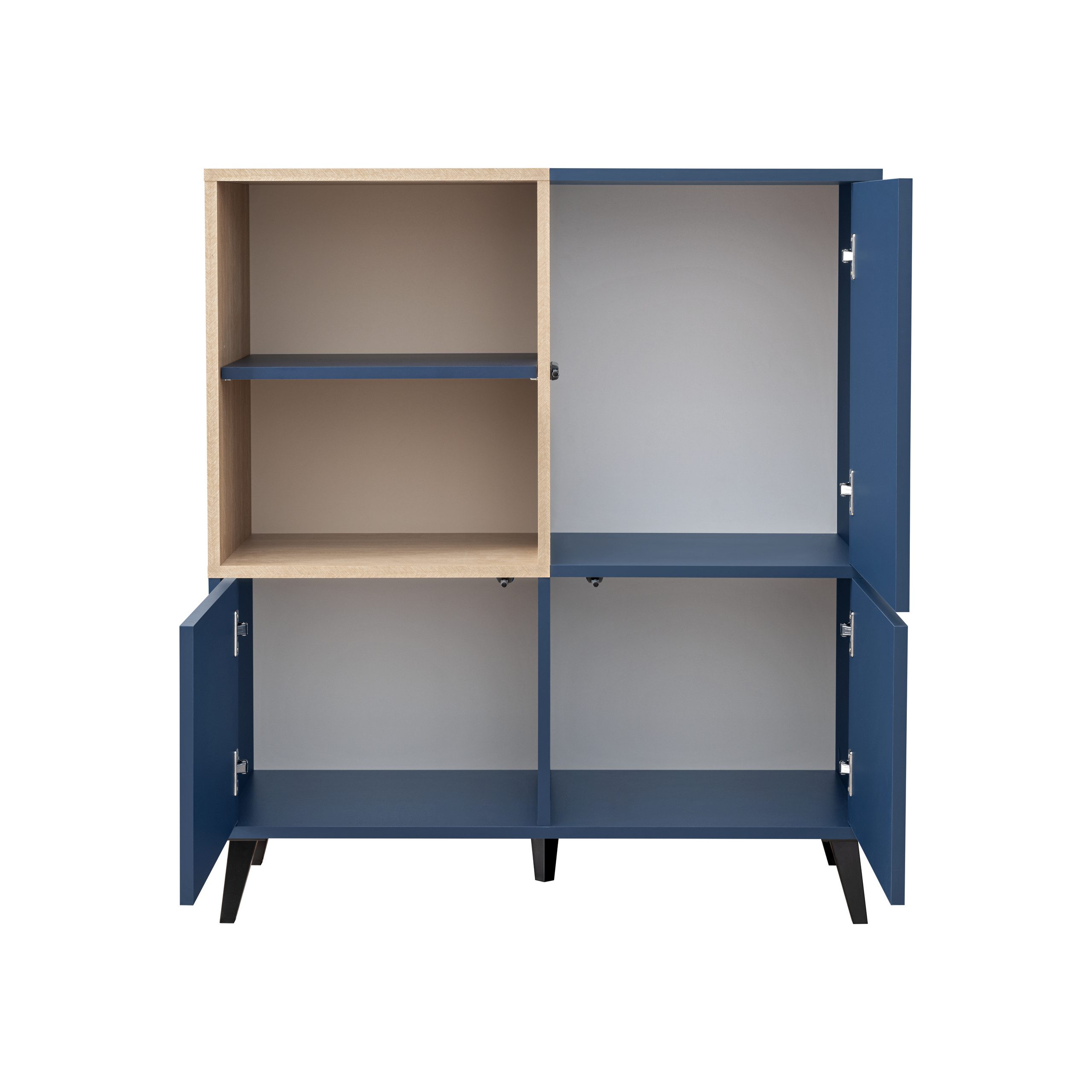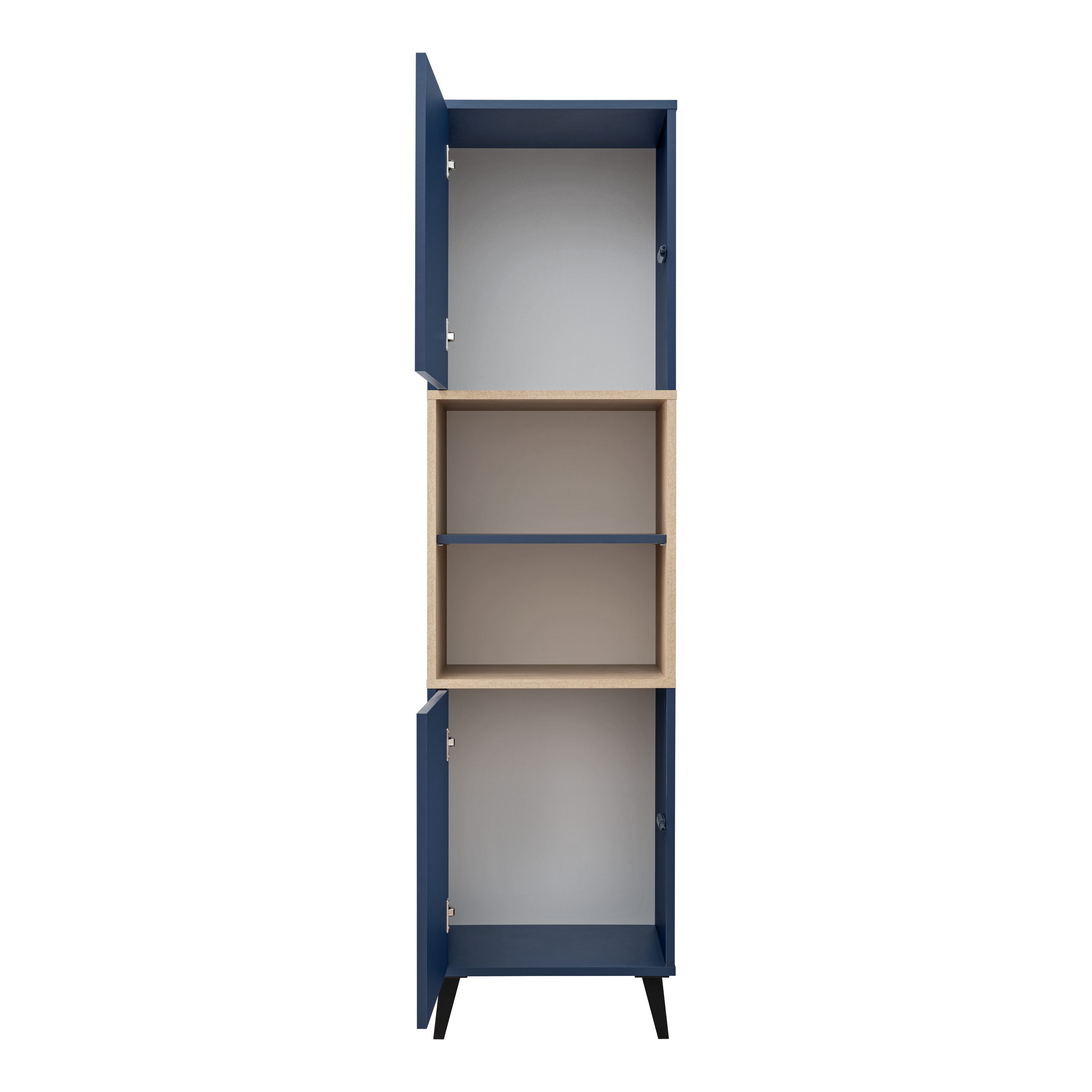 The furniture is made of durable, scratch-resistant board. Thanks to the original color combination — deep navy blue with Scandinavian fir — and timeless design, the set fits various interiors: modern, minimalist, Scandinavian, and loft. The legs, reminiscent of 60s and 70s furniture, add a touch of discreet elegance.