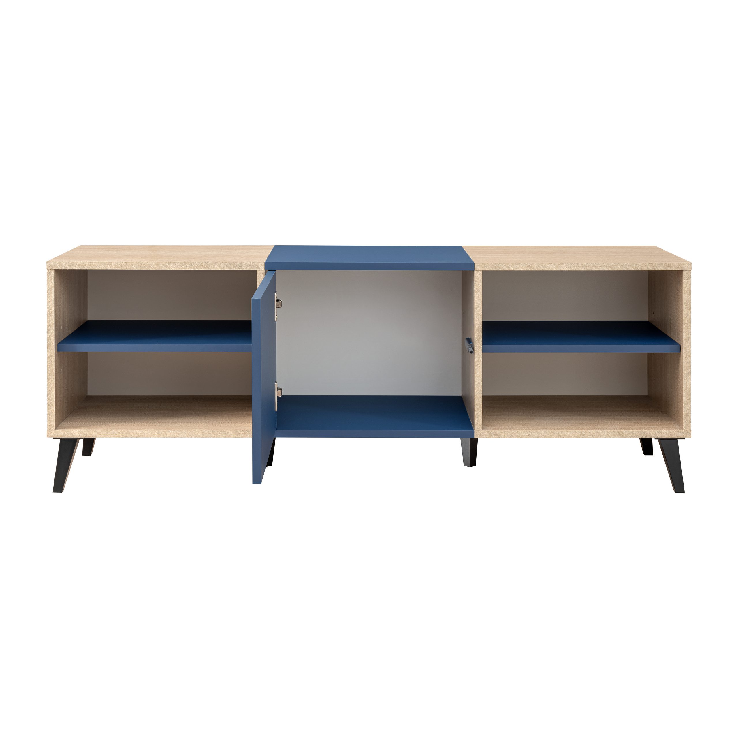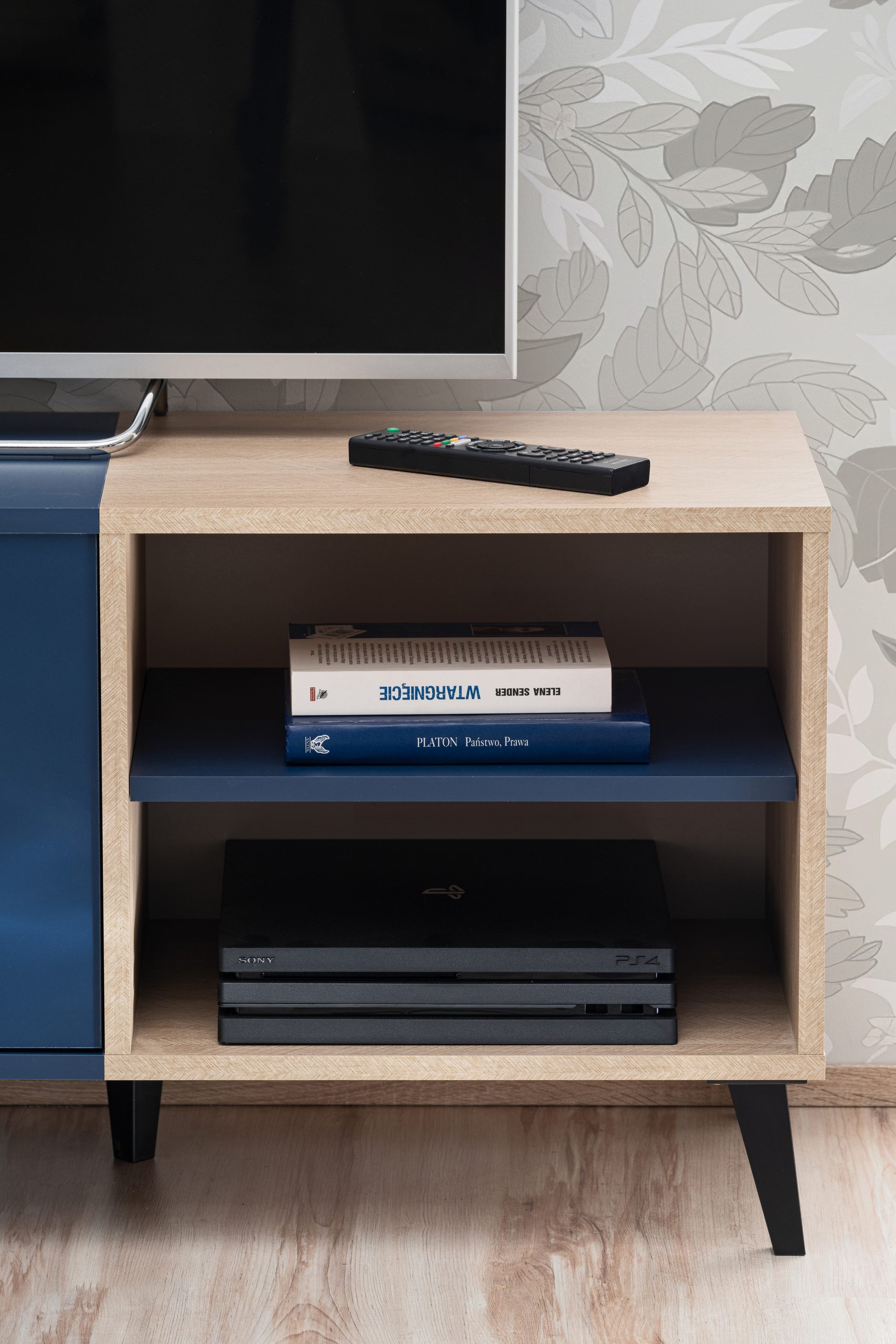 The cabinet is made from durable, scratch-resistant laminated board. Thanks to the original color combination — deep navy blue with Scandinavian fir — and its timeless design, the cabinet fits perfectly into various interiors: modern, minimalist, Scandinavian, and loft. The legs, inspired by 1960s and 70s furniture, add discreet elegance. The Fondi TV cabinet and other pieces in the collection are also well-suited for smaller apartments.