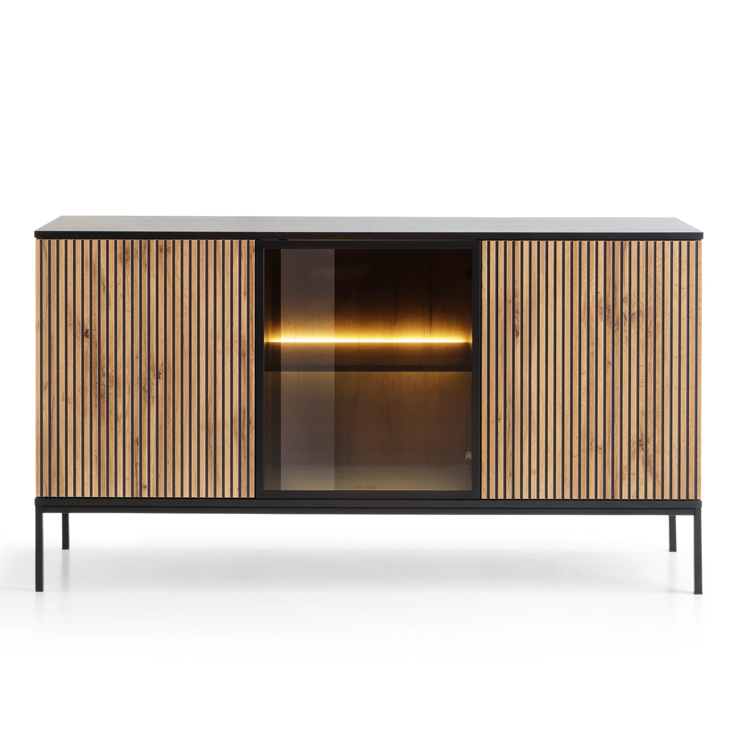 The Laval K154 chest of drawers is a piece of furniture created for modern and loft interiors. Its roomy wotan oak design is complemented by black accents and decorative slats on the front, which gives the whole an elegant character. The three-door layout with a push-to-open system allows for comfortable and aesthetic use without visible handles. The interior of the chest of drawers hides numerous shelves that can accommodate documents, tableware or home textiles. It is a functional and stylish solution for the living room, dining room or hallway.