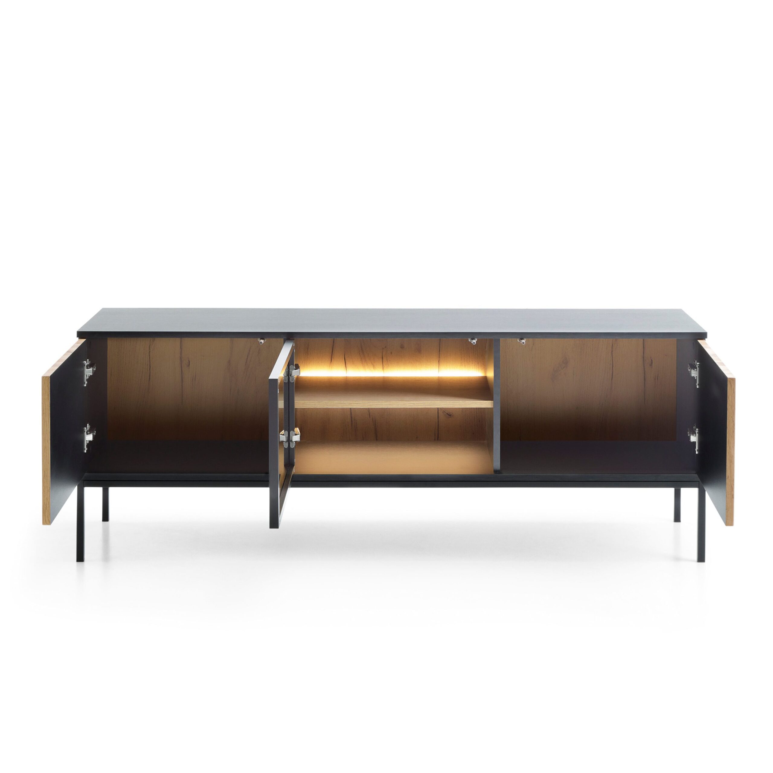 The Laval 154 TV cabinet is an elegant and modern piece of furniture with a distinctive, monochromatic style. The matte body contrasts subtly with the glossy front, which creates a particularly stylish effect. Two flaps closed with the push-to-open system and a central recess create a functional space for storing and displaying audio/video equipment. The black metal legs lift the structure and add lightness while providing stability. The Laval RTV154 is perfect for a modern living room, loft interior or minimalist living space.