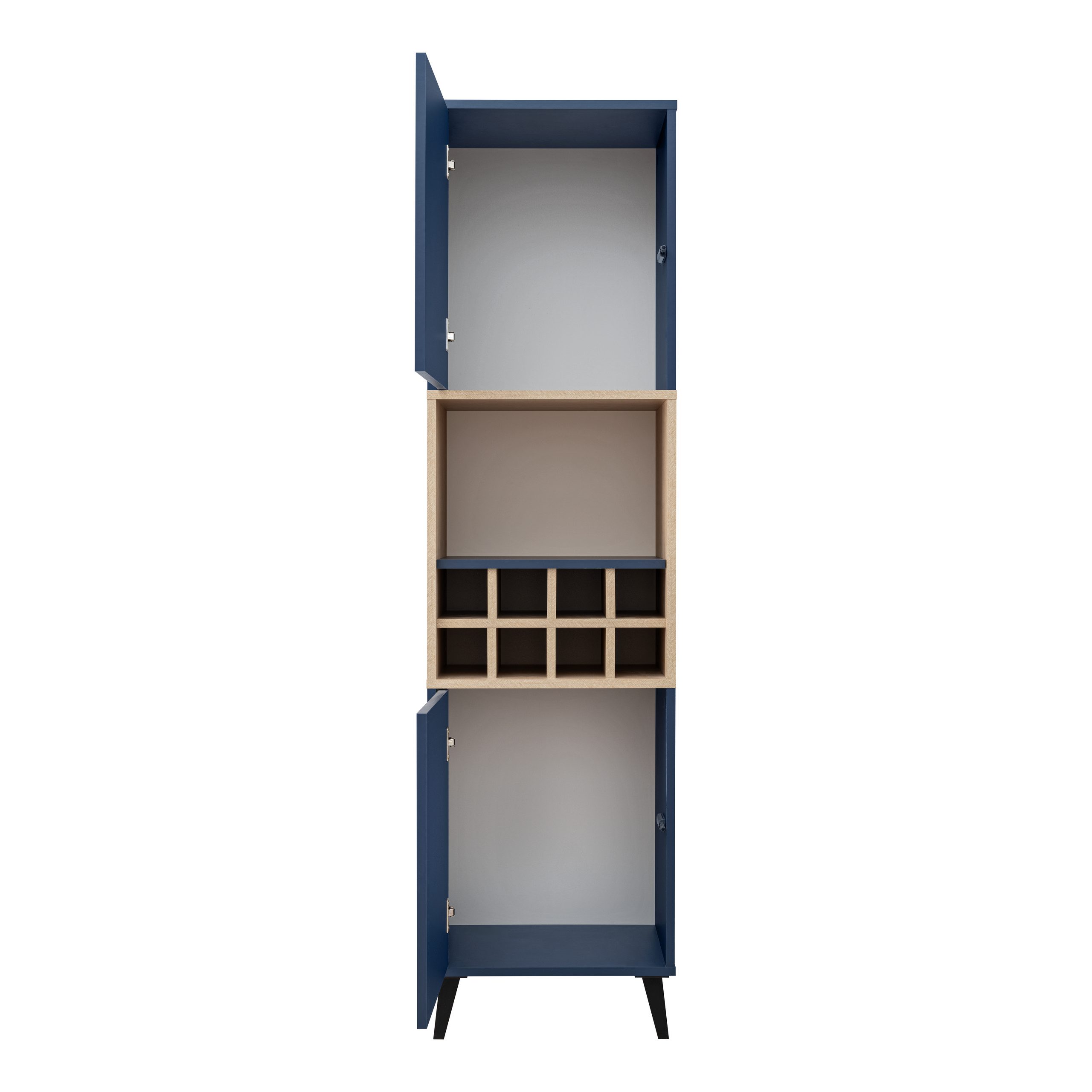 The furniture is made of durable, scratch-resistant board. Thanks to the original color combination — deep navy blue with Scandinavian fir — and timeless design, the set fits various interiors: modern, minimalist, Scandinavian, and loft. The legs, reminiscent of 60s and 70s furniture, add a touch of discreet elegance.