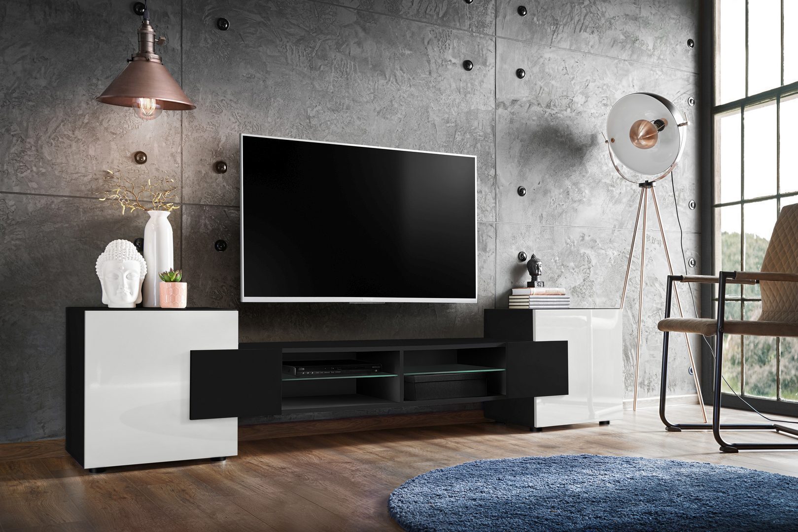 The Merano TV cabinet blends perfectly with various interior styles, especially modern and Scandinavian. The fronts of the side cabinets have a glossy finish, while the body and central section feature a matte finish. In the Merano cabinet, you’ll find space for your favorite books, keepsakes, or documents – these can be stored in the enclosed section.