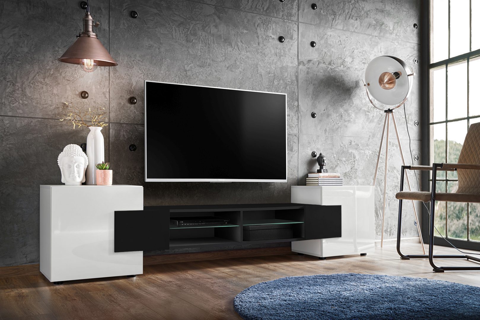 The Merano TV cabinet blends perfectly with various interior styles, especially modern and Scandinavian. The fronts of the side cabinets have a glossy finish, while the body and central section feature a matte finish. In the Merano cabinet, you’ll find space for your favorite books, keepsakes, or documents – these can be stored in the enclosed section.