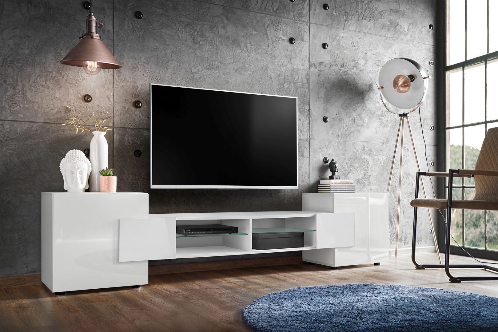 The Merano TV cabinet blends perfectly with various interior styles, especially modern and Scandinavian. The fronts of the side cabinets have a glossy finish, while the body and central section feature a matte finish. In the Merano cabinet, you’ll find space for your favorite books, keepsakes, or documents – these can be stored in the enclosed section.