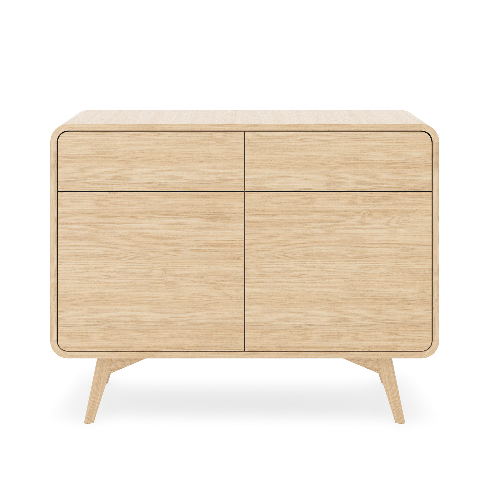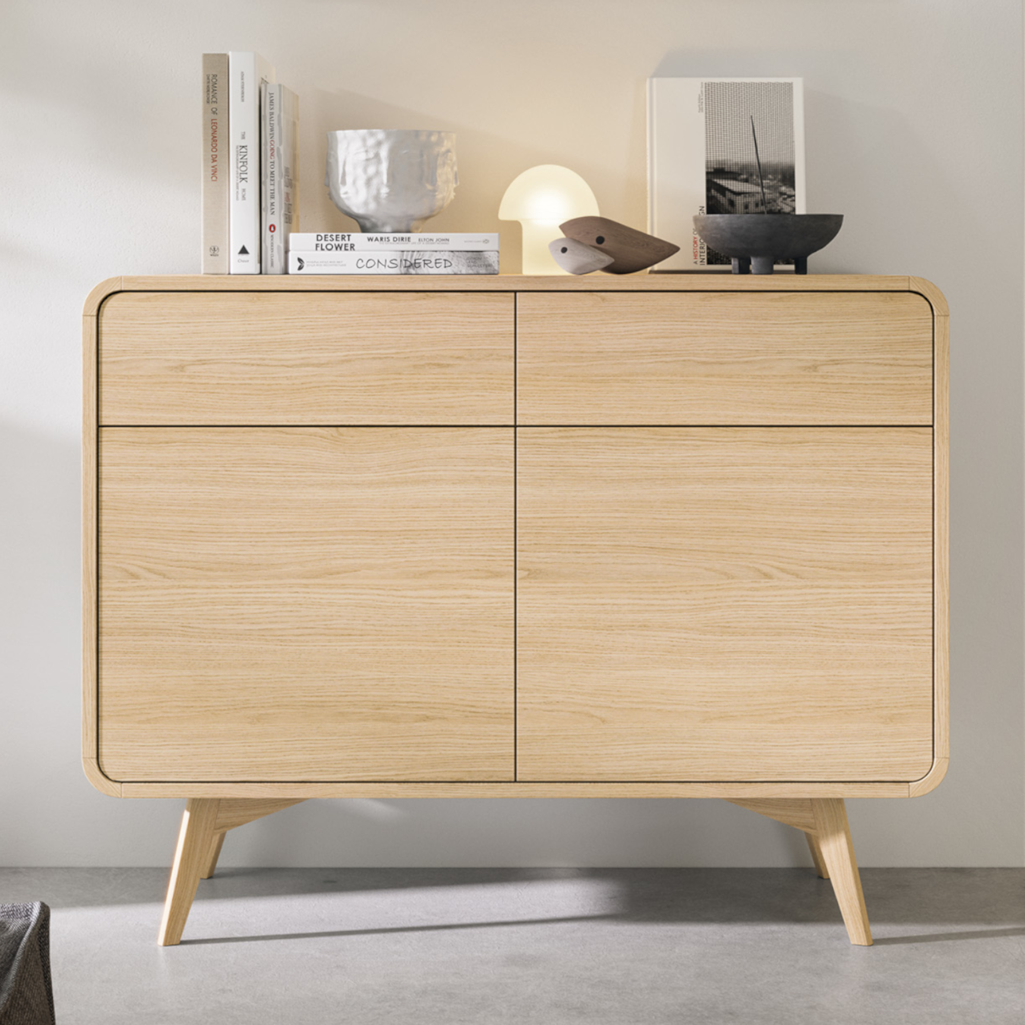 Cornwall sideboard 108 cm – functionality and warmth of natural wood. The Cornwall sideboard is a perfect choice for anyone looking for a compact yet spacious piece of furniture in a timeless style. Finished in Vicenza oak decor, it brings a cosy atmosphere and the natural charm of wood to the room, working equally well in modern and classic interiors. The well-thought-out layout makes everyday use very convenient: 2 practical push-to-open drawers provide quick access to small items, accessories or documents, while 2 closed compartments with shelves hold larger pieces such as textiles, boxes or items that are used less often. Gently rounded edges add lightness and a contemporary look and also increase safety – especially in homes with children. The entire structure stands on wooden legs that ensure stability and give the piece an elegant, classic character. The compact width of 108 cm means the Cornwall sideboard fits perfectly into smaller spaces – the living room, bedroom, hallway or home office. It is a piece that combines functionality with aesthetics, offering both storage space and a subtle decorative element in one. Dimensions: width 108 cm, height 85 cm, depth 39 cm. Materials and workmanship: body and fronts made of 16 mm laminated board in Vicenza oak decor; edges finished with 0.5 mm ABS edging; fronts: 2 push-to-open drawers and 2 hinged doors; legs: stable wooden legs in a classic finish; assembly: self-assembly, instructions included.