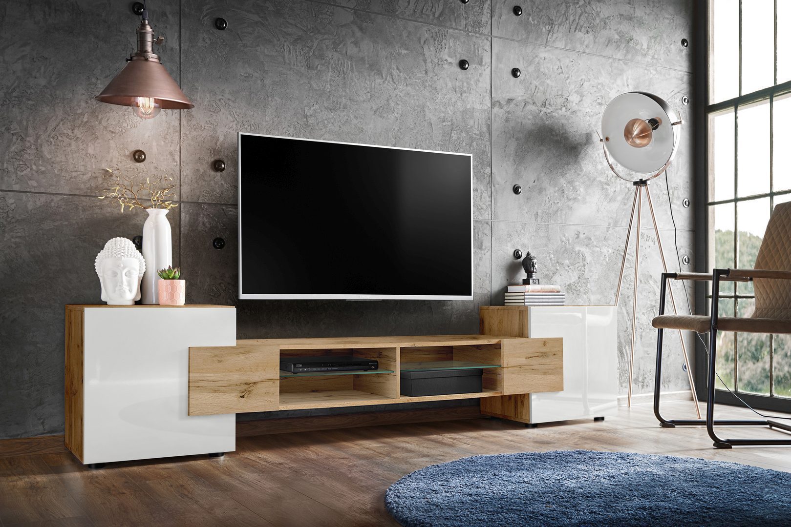 The Merano TV cabinet blends perfectly with various interior styles, especially modern and Scandinavian. The fronts of the side cabinets have a glossy finish, while the body and central section feature a matte finish. In the Merano cabinet, you’ll find space for your favorite books, keepsakes, or documents – these can be stored in the enclosed section.