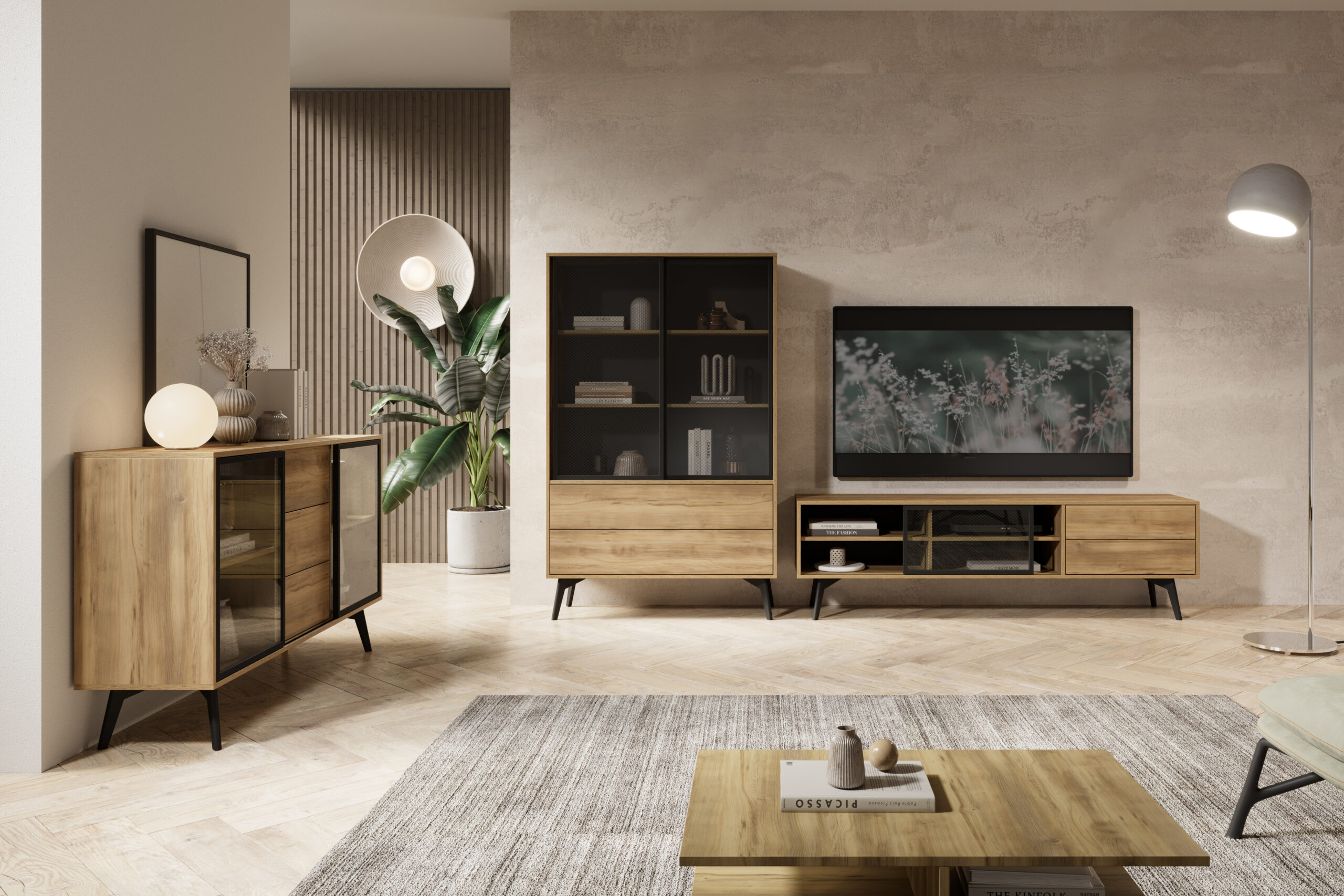 Estevan TV cabinet – functionality and style in one. Create a modern and practical TV area with the Estevan TV cabinet. This piece not only allows you to display the TV and multimedia equipment in an attractive way but also offers comfortable storage for everything you want to keep within easy reach in the living room. The wide top easily holds a TV, decorations or favourite plants – its maximum load is 20 kg, ensuring durability and safe use. Two spacious drawers (up to 2 kg each) store documents, small accessories or spare cables. Four practical shelves make it easy to keep remote controls, gamepads or a router organised so that everything has its place. A key advantage of this cabinet is the sliding glass front, which adds elegance and makes it easy to hide part of the contents – one simple movement is enough to restore a tidy look. The Estevan TV cabinet is also visually impressive. The warm baroque-oak decor in a golden tone brings a cosy atmosphere, while black structural elements emphasise its industrial character and highlight the natural grain of the wood. This combination makes the unit ideal for modern and loft-style interiors, where it becomes both the functional and visual centre of the living room. Dimensions: width 180 cm, height 54 cm, depth 39 cm. Materials and workmanship: body and fronts made of 16 mm laminated board in baroque-oak decor; sliding glass front; edges protected with 0.5 mm ABS edging; sturdy black legs; storage layout: 2 drawers + 4 shelves + sliding glass front; assembly: self-assembly (instructions included).