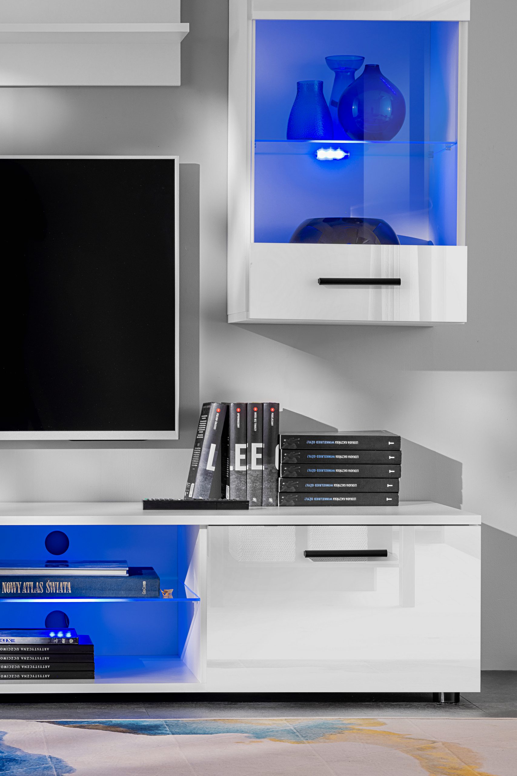 • If you choose blue or RGB LED lighting, you’ll receive lighting for the TV cabinet and both wall cabinets